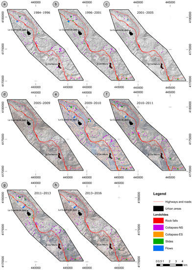 Multitemporal landslide inventory: (a) 1984–1996; (b) 1996–2001; (c) 2001–2005; (d) 2005–2009; (e) 2009–2010; (f) 2010–2011; (g) 2011–2013; (h) 2013–2016. Collapses in natural slopes (NS) and in engineering slopes (ES). Coordinates are found in ETRS89-UTM30.