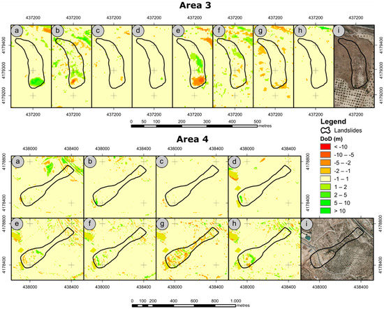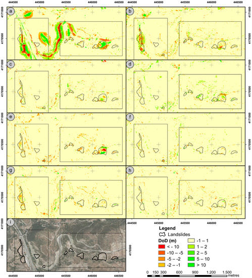 Finally, based on the uncertainty of the DoDs, another filter was applied in order to discard those areas with height differences with an absolute value lower than 1 m and also to reduce noise. In this sense, since, in this study, DoDs were only used for detecting unstable areas and estimating their activity but not for quantifying volumes, more complete approaches were not considered [49,53].
