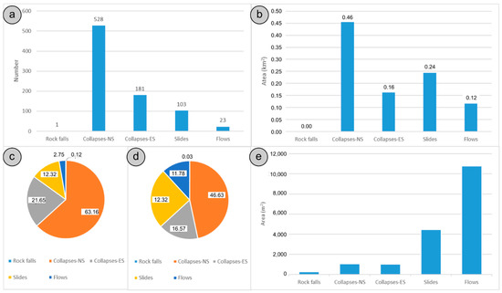 Figure 5 shows the inventory differenced by periods, and Table 4 displays the corresponding analysis. Three basic landslide typologies were identified: falls–collapses, slides and flows [38,39]. In general terms, landslides cover 0.98 km2, representing 1.90% of the study area. In the first class, rock falls and collapses, only one rock fall in the strict sense was identified. Moreover, collapses in natural and engineering slopes were distinguished. Natural collapses extended for 0.46 km2 (46.63% of the landslide area), collapses in engineering slopes extended for 0.16 km2 (16.57%), slides extended for 0.24 km2 (25.00%) and flows extended for 0.11 km2 (11.78%). Average areas ranged from about 1000 m2 of collapses (both natural and engineering slopes), to nearly 4500 m2 of slides and 10,800 m2 of flows. The height interval had an average value of about 20 m, ranging from 15 to 19 m in collapses to around 40 m in slides, flows and rock falls. The average H/D ratio was 0.48, ranging from 0.19 in flows and 0.5–0.6 in slides and collapses to 2.23 in rock falls.