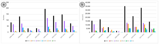 Multitemporal analysis showed that the periods with higher activity were, in this order, 2009–2010, when the total area affected was of 0.35 km2 and there were 196 landslides, and 2011–2013 with 0.33 km2 and 149 landslides. Next, the periods 2010–2011 and 1996–2001 presented areas of 0.22 and 0.17 km2, respectively, and a number of landslides of 138 and 132 m. The remaining periods, 1984–1996 (0.16 km2 and 82 landslides), 2013–2016 (0.14 km2 and 74 landslides) and especially 2001–2005 (0.07 km2 and 32 landslides) and 2005–2009 (0.02 km2 and 33 landslides), had lower activity. Landslides presented average areas ranging from about 1500 to 2000 m2 in most periods, except in 2005–2009 when the area was of around 600 m2. Average height intervals varied ± 5 m between the different periods, the largest variations being in slides (from 12 m in 2005–2009 to 59 m in 2013–2016) and flows (from 25–40 m in most periods to more than 50 m in 2010–2011 and 2013–2016). H/D indexes were usually very uniform in general (0.4–0.5) for all typologies.