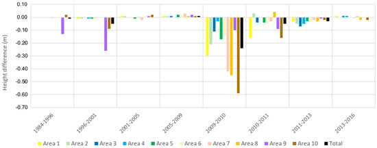 As well as the multitemporal inventory, a set of common landslide areas throughout the whole period (1984–2016) was considered in order to monitor the landslide activity in the study area (Figure 6). Table 5 shows the results of this analysis, which was mainly focused on the rate of height differences between DSMs, both the average of the whole areas and the average of sectors with negative and positive values.