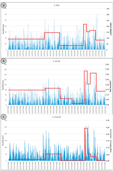 Relationships between landslide activity and rainfalls: (a) 1-day rainfalls and landslide number; (b) 1-week rainfalls and total area (km2); (c) 1-month rainfalls and average height differences.