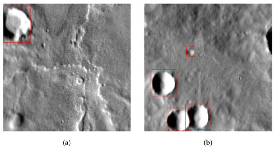 In order to train and evaluate the proposed network, we created a Mars crater image dataset. It assembles a total of 92,575 images extracted from a Mars global mosaic [16] with a size of 25.6 km × 25.6 km ( pixels at the equator). All craters in the images are annotated with instance-level bounding boxes (BBOXes) utilizing the Martian impact crater database by Robbins and Hynek [14]. Figure 1 shows examples of the generated crater images and labels.