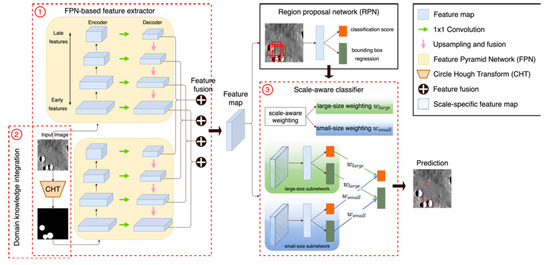 Although popular, directly applying the Faster R-CNN still cannot yield high-quality prediction due to the challenging nature of Mars crater detection. The following sections introduce three new features added to Faster R-CNN (Figure 3) to enable scale-aware, knowledge-driven deep learning for automated Mars crater detection.