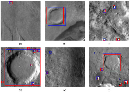 (a–f) illustrate sample detection results for Mars craters at different locations on the Mars surface. The ground-truth Bounding Boxes (BBOX) are labeled in red and model prediction results are the blue boxes.