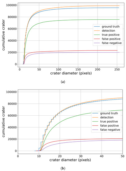 To further evaluate the model performance (model with FPN + D + S), the cumulative plots were generated for analyzing the model’s predictive performance against the 46,287 testing images. The number of ground truth labels, the model detection results, true positive, false positive and false negative results at different crater sizes are presented. Among which, true positive results are correct detections from the model; false positive results refer to the non-crater objects detected as craters; false negative results refer to craters failed to be detected by the model. Figure 6a shows the accumulative plot for all the results and Figure 6b shows part of the results with crater size smaller than 50 pixels (5 km in diameter). The results show that (1) the model predicted more results (orange line) than the ground-truth data (blue line), but the difference is small; (2) the number of true positive results are about three times as many as the false positive results; and (3) most false positive results are detected in smaller craters (with diameter smaller than 5 km/50 pixels). A portion of these false negatives might be craters (blue-only boxes in Figure 5). They will be further analyzed through joint efforts with Earth and space scientists. If our assumption is true, our model actually has higher prediction accuracy than the current numbers. These findings can be used to further enrich the knowledge about Mars’ craters and the land surface processes on Mars.