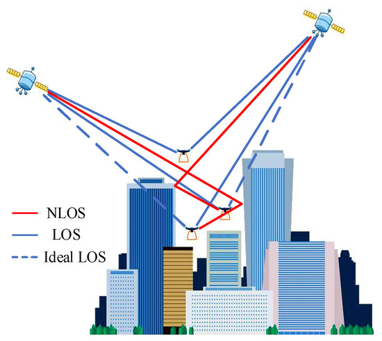 Unmanned aerial vehicles (UAVs) and ground vehicles are emerging mobile platforms that can be beneficial to many mission-critical applications in smart cities. These include delivery, search and rescue missions, and civil security [1]. In order to support these mission-critical applications, the on-board navigation system, especially the Global Navigation Satellite System (GNSS), is essential for providing accurate and reliable Positioning Navigation and Timing (PNT) information. In practice, however, the accuracy and reliability of GNSS positioning is always affected by a variety issues in urban areas, especially in respect to pseudorange-based positioning. The increased positioning uncertainty that arises from a mixture of faulty signals is a result of the signal challenges posed by urban areas, mainly due to the NLOS/multipath effects from the surrounding environments (e.g., skylines, canyons, tunnels, etc., seen in Figure 1). In addition, malfunctions in the satellite clock, an incorrect modelling of orbits, the ionisation of satellite payload silicon material, and inter-channel bias could also contribute to the excessive positioning errors [2]. It is therefore very important to guarantee that the GNSS signals received from different satellites are correct and accurate, since these are related to GNSS positioning performance and integrity evaluation.