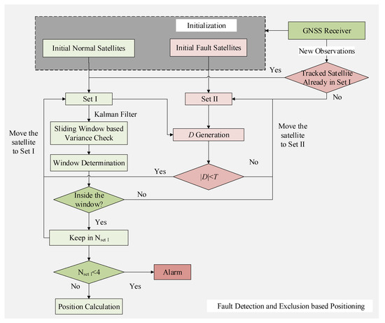 The “normal” measurements are stored in the dataset named “Set I” and the “non-trustable” measurements are stored in the dataset named “Set II” (this initially contains only satellites with faulty measurements, but during the operation it will contain “new” satellites that did not exist at last epoch, which may or may not have faulty measurements), shown in Figure 3 as an example. During the operation, once a new observation (which means the satellite is observed at a specific epoch) is received, a judgement is carried out to check whether this satellite has already been tracked in Set I, in which case the observed information is added to Set I (contains tracked satellites), otherwise the observed measurements are added in Set II (contains faulty satellites and newly observed satellites). Although the sliding window and the detector are applied separately for fault detection, fault removal and recovery, Set I and Set II are then constantly updated according to the detection results at each epoch with satellites re-assigned between the sets by the proposed algorithm