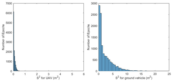 Here, n is the number of satellites; is the KF innovation of each satellite at k epoch; is the mean of all the KF innovations detected at the k epoch, and is the variance. The distribution of the value is in Figure 4. When the value of is smaller than the threshold (under the confidence level of 99.9%) (Gatti, 1984), which is 5.11 and 23.53 for UAVs and ground vehicles in urban areas from a priori data, respectively, in this paper, we can consider that these measurements of satellites are not faulty. However, when non-zero and real faults occur simultaneously, the will become much bigger than the threshold too. If we consider all the satellites as faulty, the satellite availability will be degraded in a real-world situation. In order to solve this problem, assuming that N satellites are received by the receiver at epoch k, to find the satellite which includes both the non-zero and the real faults from those only containing non-zero , an adaptive sliding window is designed as follows.
