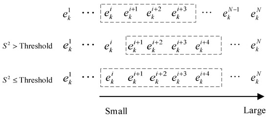 - Sort all of the (I = 1, 2 … N) of satellites in Set I at epoch k from the smallest (left) to the largest (right), shown in Figure 5.