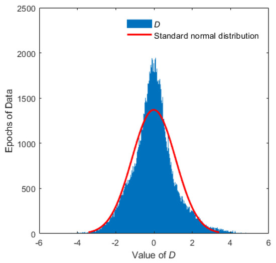 After the normalization in (21), the distribution of the detector D can be considered to follow a standard normal distribution. Figure 6 is an example of the distribution of the detector D from the real UAV flight test. In general, the detection threshold T is determined according to the principle [27]. However, in a real case, we can choose a larger value of T based on the requirement of the system positioning accuracy. However, the minimum value of T should be no less than the value. By using this strategy, some minor errors are inevitable in the pseudorange measurements. Nevertheless, it is not necessary to remove all errors completely, since where errors are small enough not to affect our positioning results, removing those satellites so as to rely on a smaller number of satellites with poor geometries for positioning would risk enlarging positioning errors. For this reason, it is critical to achieve a trade-off between the satellite number and the pseudorange quality in the determination of the threshold. Therefore, we set , which is much bigger than the value (i.e., 3).
