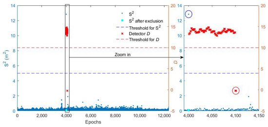 The detector D, is created based on the difference in the observed pseudoranges of the satellites in Set II and the predicted pseudoranges, calculated based on the real-time position obtained from the positioning solutions of the satellites in Set I at the current epoch, and the measurement information of the satellites in Set II, to check whether these satellites (already in Set II or newly observed satellites in Set II) are normal or not (Section 2.5). The D results are then compared with the threshold T to determine whether the satellite is still presenting faulty data or recovering to normal, and the movement of the corresponding satellites between the sets will be carried out accordingly. Once the faulty satellite in Set II is excluded, the |D|, the absolute value of D, immediately drops below the threshold. If the |D| value remains below the threshold for two consecutive epochs, we will move the satellite back to Set I where it would be used at that epoch for the positioning calculation. The threshold determination for D is described in Section 2.5 as well.