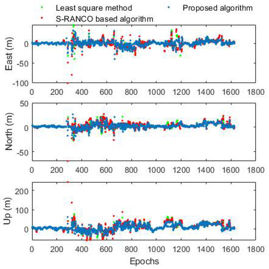 The proposed algorithm demonstrates the effectiveness of the positioning accuracy improvement in urban areas. From Table 11, it can be seen that the improvement in the positioning accuracy from the FDE based GNSS positioning algorithm is 30.47%, 7.72% and 27.24% in East, North and Up directions when compared with that from traditional single point positioning. The horizontal and 3D positioning accuracy has been improved to 8.3 m and 18.0 m from 10.6 m and 24.3 m, respectively, with improvements of about 21% and 26% using the proposed FDE algorithm. In contrast, the S-RANCO based algorithm only shows limited capability in improving the performance of GNSS positioning results, with only 1.9% and 5.3% improvements in horizontal and 3D, respectively. What is worse, the positioning error enlarges by 9.7% in a North direction. It is indicated from Figure 10 that for the epochs around 300 s, the proposed algorithm can even provide an improvement of up to about 80% in both horizontal and height positioning results, while the S-RANCO based algorithm cannot acquire such achievement. The overall improvement of about 26% is because the NLOS does not exist at each epoch. Our algorithm cannot improve the positioning accuracy of the epochs without NLOS, therefore the improvement of partial epochs would be reduced by using the whole epochs to calculate the positioning accuracy.
