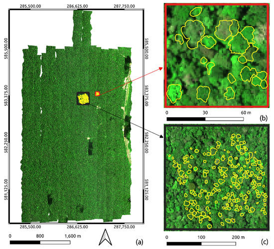 Red, green and blue (RGB) composite of airborne imaging spectroscopy acquired (R: 665 nm, G: 560 nm, B: 490 nm): (a) over the study site; (b) Site A; (c) Site B. Delineated individual tree crowns (ITCs) are represented by yellow polygons.