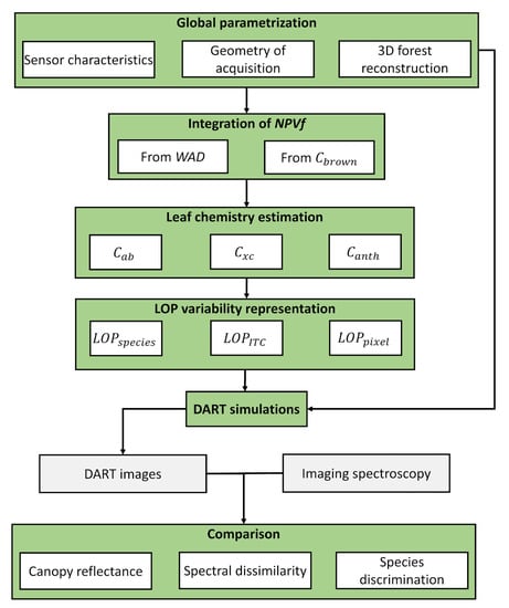 The lack of information on the non-photosynthetic vegetation fraction (NPVf) and an inadequate characterization of the diversity of LOP have been shown to contribute to the relatively low radiometric agreement between simulation and experimental data [49,54,57]. Simulating the variability in canopy reflectance is challenging in many ways, as it requires definition of fine scale 3D structure and heterogeneity of LOP. While airborne laser scanning (ALS) potentially fulfills the requirements for the definition of the 3D structure, the definition of LOP also needs to be addressed using indirect estimation, as sampling within and among species variability in optical properties in hyperdiverse ecosystems is not feasible. To address those challenges, we designed a methodology aiming at simulating spatial heterogeneity in spectral data over a complex tropical forest using the DART model. We used ALS data in order to reconstruct 3D forest architecture. Then, we defined scenarios to account for NPVf using different proxies based on 3D structure or canopy reflectance. Once an optimal scenario to characterize NPVf was defined, we performed simulations accounting for LOP variability at different scales (pixel, crown, species). Finally, we compared simulations to airborne imaging spectroscopy using statistical metrics, dissimilarity metric and supervised classification methods. The main objective of this study was to define a framework for producing realistic simulations in the perspective of supporting methodological development for biodiversity assessment using 3D modeling, considering: (i) the effects of incorporation of NPVf into simulation and (ii) the influence of LOP variability on the spectral response simulated by the DART model.