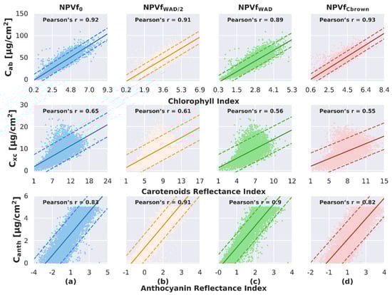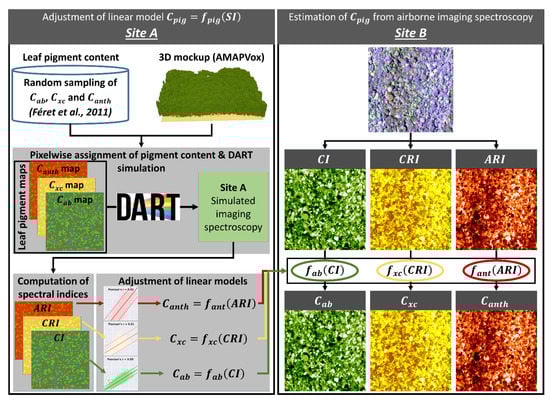 Parametric regressions based on vegetation indices and linear or polynomial models are the most straightforward means of estimating pigment content [83,84,85]. However, the adjustment of such empirical models requires a large amount of field data. Hybrid approaches provide a means to overcome this dependency on field data: they are based on the simulation of a training dataset (corresponding to LOP or canopy reflectance) using appropriate physical models and sampling strategy, in order to adjust a regression model applicable to experimental data. Therefore, we chose a hybrid approach in this study, in order to train regression models linking spectral indices with leaf pigment contents, including Cab, Cxc, Canth and Cbrown. This approach is based on two steps: First, the regression models were adjusted based on a simulation including a broad range of pigment content. Here, we adjusted a linear model specific to each pigment and each NPVf scenario, based on simulations performed on Site A. Then the linear models were applied on experimental data corresponding to Site B, in order to define specific pigment content for each NPVf scenario. Figure 3 illustrates the procedure used to adjust regression models for the estimation of leaf pigment content from spectral indices, and to estimate pigment content from airborne imaging spectroscopy on site B based on these regression models.