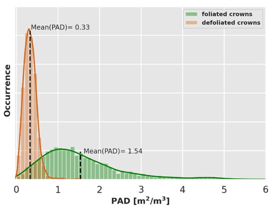 Distribution of mean plant area density (PAD) of the three uppermost voxels corresponding to foliated and defoliated tree crowns delineated from VHSR data interpretation.