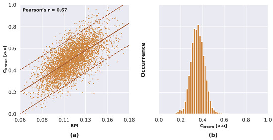We used three spectral indices to estimate Cab, Cxc and Canth from remotely sensed data: the Chlorophyll Index (CI) (Equation (3)), the Carotenoids Reflectance Index (CRI) (Equation (4)) and the Anthocyanin Reflectance Index (ARI) (Equation (5)) [86]. These spectral indices were applied on imaging spectroscopy for various ecosystems including forest [28,29,87]. Due to the lack of documented spectral index for Cbrown in the literature, we defined a Brown Pigment Reflectance Index (BPI) (Equation (6)) based on reflectance measured in the red-edge and NIR domains. The spectral band selected in the red-edge was centered on 750 nm, which is characterized by negligible absorption of Cab compared to Cbrown.