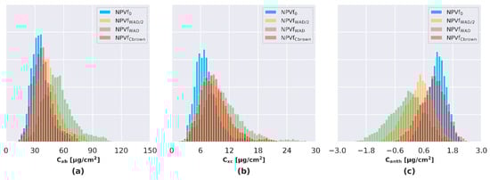 The PAD of three uppermost voxels of the selection of foliated and defoliated ITCs was averaged in order to analyze their distribution. The mean PAD corresponding to defoliated and foliated tree crowns was 0.33 m2·m−3 and 1.54 m2·m−3, respectively (Figure 4). NPVfWAD, defined as the ratio of these two mean densities, was then set to 21% in simulations. Other studies reported NPVf ranging between 10% and 50% depending on forest type and stage [55,95,96]. In order to account for potential shadowing of woody elements by leaves [62], we also tested a scenario corresponding to 50% of NPVfWAD hereafter referred to as NPVfWAD/2. For each of these scenarios, the optical properties corresponding to generic wood optical properties were assigned to a constant proportion of PAD defined as NPVfWAD or NPVfWAD/2. The complementary fraction of PAD corresponding to LAD was characterized by LOP with pigment content defined as described in Section 4.3.