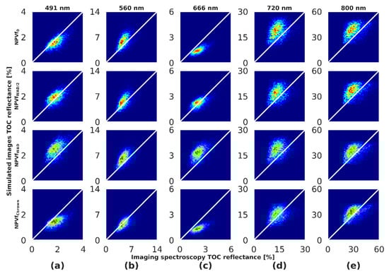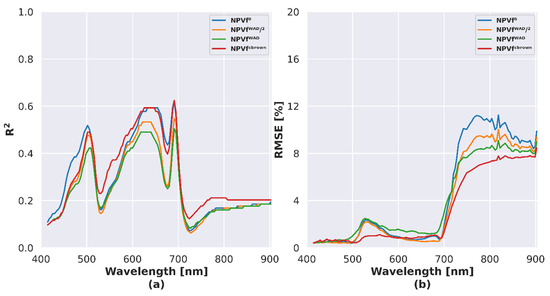 Different statistical criteria were used to compare the observed () and simulated TOC reflectance () in the VNIR spectral domain. These included the root mean square error (RMSE) (Equation (7)) and the coefficient of determination (R2) (Equation (8)), computed as follows for each spectral band of the sensor:
