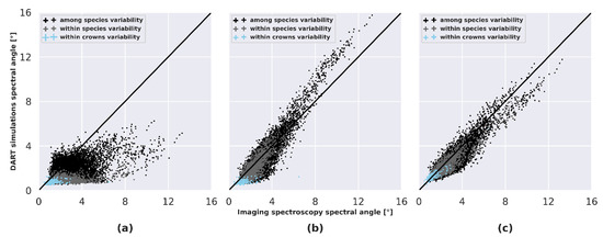 Tropical tree species discrimination using supervised methods remains challenging, and assuming a direct link with within- and among-species variability of canopy reflectance is a simplification [89]. A number of statistical metrics of variability such as the coefficient of variation, the spectral angle or the minimum distance from the spectral centroid can be used to relate spectral diversity to plant diversity [22]. In this study, the spectral angle [90], defined in (Equation (9)), was used to compare spectral dissimilarity between experimental data and simulated data. The spectral angle was computed on sunlit pixels at three level using the 135 spectral bands: (i) within crown for all pairwise combinations of pixels of a given crown, (ii) within species for all pairwise combinations of crowns of a given species, and (iii) among species, for all pairwise combinations of species. The comparison between the dissimilarity matrices of observations and simulations was done at each level with Pearson’s correlation coefficient and RMSE.