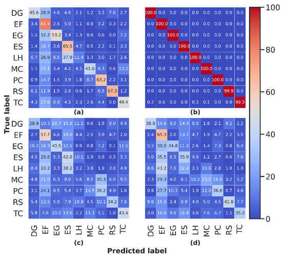 A large number of publications evidenced the interest of imaging spectroscopy data for the discrimination among species, even for tropical forests showing strong diversity [24,62,89,91,92,93,94]. On a higher ecological level, this capacity to discriminate among species based on spectral information is also a fundamental property for methods aiming at estimating diversity indices based on the heterogeneity of spectral information [28,29,34]. In this study, we used the performances of species discrimination based on supervised classification as an indicator of the realism of our simulated imaging spectroscopy data. Species discrimination applied in real situations inherently leads to successful classification for species characterized by high discriminability, and confusion between species showing lower discriminability. This capacity to accurately identify a species or misidentify it as another species is explained by the expression of vegetation traits. In our study, we applied supervised classification for species identification on both experimental and simulated imaging spectroscopy data, hypothesizing that realistic simulations would lead to similarity in the confusion matrix derived from classification when compared to the confusion matrix derived from experimental data. We used linear discriminant analysis (LDA) as a supervised classification algorithm in order to perform species classification [62,89,92].