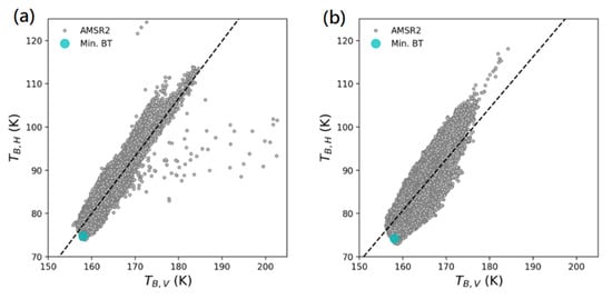 Scatterplots of brightness temperature (BT) and the minim BT for the Arctic (a) and Antarctic Ocean (b).