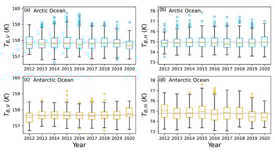 Boxplots for Annual mBT for the Arctic ((a) for V-polarization and (b) for H-polarization) and Antarctic Oceans ((c) for V-polarization and (d) for H-polarization).