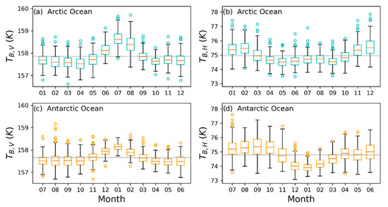 Boxplots for Monthly mBT for the Arctic ((a) for V-polarization and (b) for H-polarization) and Antarctic Oceans ((c) for V-polarization and (d) for H-polarization).