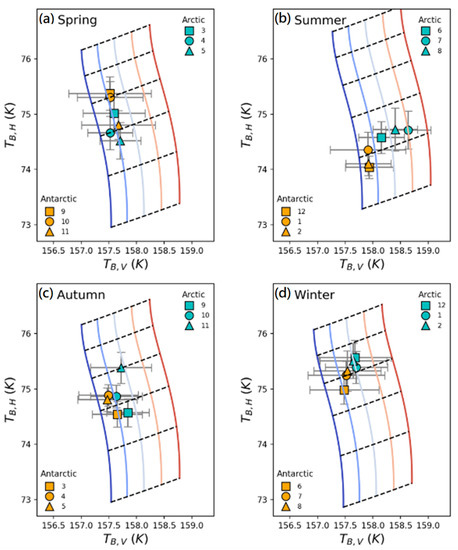 We illustrate seasonal mBT variation in the Arctic and Antarctic Oceans and the result of RTM simulations in Figure 4. The cyan- and orange-colored symbols in each plot represent the mBTs of the Arctic and Antarctic Oceans, respectively. The vertical solid curves indicate BT with the same SST, corresponding to −1.8, −1, −0.2, 0.6, and 1.4 °C from left (blue) to right (red). The horizontal dashed lines show the simulated BT with the same SSW corresponding to 0, 1, 2, 3, 4, and 5 m/s from bottom to top. The atmospheric conditions in RTM simulations were applied differently for each season: IWV = 5 mm for spring and autumn, 3 mm for winter, and 12 mm for summer. Overall, the SST of the estimated monthly mBTs remained below 0 °C for all seasons except summer (July and August) in the Arctic Ocean. The monthly mBT in August reached a relatively high SST of up to 0.6 °C. The Antarctic Ocean’s monthly mBTs maintain a low SST near the −1.0 °C curve. SSW in both the Arctic and Antarctic Oceans showed a pattern of weakening in the summer and strengthened in the winter. In the summer, a weak SSW of less than 2 m/s is dominant in both oceans. The SSW tends to increase from autumn (less than 2 m/s in Figure 4c) to winter (up to 3 m/s in Figure 4d) but decreases from winter to spring (about 2 m/s in Figure 4a).