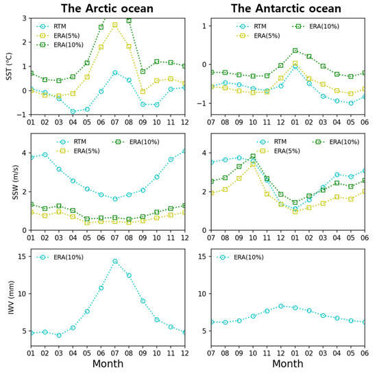 We tried estimating monthly SST and SSW for given IWV as follows. The IWV was obtained from the lower 10th percentile of ECMWF reanalysis data set (ERA5) for eight years from 2012 to 2020. Then, we can estimate the data set (SST, SSW, IWV) that best describes the estimated mBT of V- and H-pol. Figure 5 shows the monthly estimated SST and SSW by comparison of RTM simulations with monthly mBTs, and IWV as input data. We illustrated the SST and SSW from ERA5 (yellow squares for lower fifth percentile and green squares for 10th percentile) for comparison. The retrieved SST and SSW for the Antarctic Ocean were similar to the ERA5 percentiles, but those for the Arctic Ocean did not agree. The difference between the two polar oceans seems to be due to the different frequency distributions for each variable.