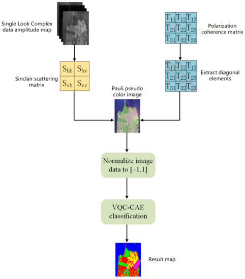 Figure 3 shows a flowchart of the polarization data preprocessing. When the original data are single look complex (SLC) data, we extract them into a scattering matrix S, and S is decomposed into three scattered components by Pauli decomposition; then, we synthesize the three components to an RGB Pauli pseudo-color image. When the original data are a polarization coherence matrix (T), we extract the diagonal elements of T and then synthesize them into an RGB Pauli pseudo-color image. Finally, the values of all pixels in the pseudo-color image are normalized to , which then are fed into the VQC-CAE network (the method proposed in this paper) to train.