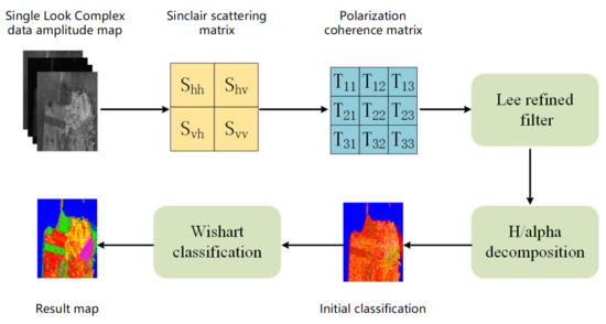 In addition, we used the classical H/alpha-Wishart algorithm as our comparison method. When the H/alpha-Wishart method is used to classify SAR images, the coherence matrix T is used as its input, which is different from our method. Usually, PolSAR data need to be processed for multi-view or filter. The purpose of this is to reduce the impact of coherent speckle noise; thus, we used the refined Lee filter in this article. The flowchart of H/alpha-Wishart classification is shown in Figure 5, where the original data are SLC data, which were extracted into a scattering matrix S, and we used S to calculate T with Equation (3). Then, we put the coherence matrix T into a refined Lee filter, and the output of the filter was taken to perform H/alpha decomposition to obtain the initial classification. Finally, Wishart clustering was used to obtain the result map.