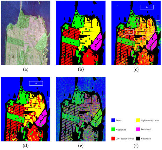 The San Francisco area of RadarSat2 was selected as data set 1. Figure 6 shows the original input image of the San Francisco data and the ground truth. The image size was pixels. In the figure, (a) is the Pauli pseudo color image, synthesized by three scattering mechanisms; (b) is the ground truth of (a), where 1,804,087 pixels are marked in the whole image of the ground truth—In total, five objects are included: water, vegetation (VEG), high-density urban (HDU), low-density urban (LDU) and developed (DEV); and (f) is the color set for the five objects, where water is blue, vegetation is green, high-density urban is red, low-density urban is yellow, developed is magenta and the unlabeled pixels are set as black.