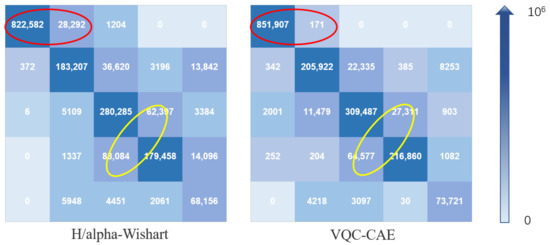 Confusion matrix of H/alpha-Wishart method and VQC-CAE model. The categories from the first row to the fifth row are water, vegetation, high-density urban, low-density urban and developed. The blue gradient arrow represents the difference of confusion matrix element values from 0 to ; the larger the matrix element value, the darker the color. The larger the value of the non-diagonal element in the confusion matrix, the easier it is to classify pixels from other categories into this category. The larger the diagonal element, the smaller the misclassification of the category.