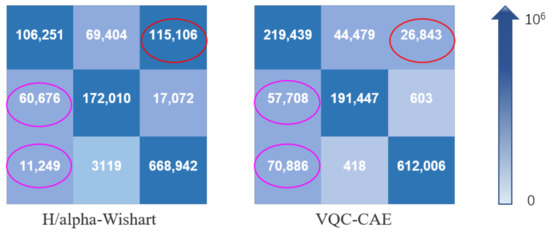 In the experiment, we compared our VQC-CAE model with the H/alpha-Wishart algorithm. The classification results after coloring are shown in Figure 8c,d. (c) is the result of H/alpha-Wishart and (d) is the result of the VQC-CAE model. The results of the experiment were processed by masked the pixels in the unlabeled area to black according to the ground truth in order to be consistent with the ground truth. First of all, comparing the two classification results, it can be seen that five types of objects were all distinguished. However, the traditional H/alpha-Wishart classification was not able to separate Build and Open areas in the areas of A and B, with most of the pixels of the red built-up area being classified into yellow open areas. On the contrary, the classification with our method of each type of objects was relatively continuous, and in the area of A, most of the pixels of the red (Build) area were classified correctly. This can also be seen from the red oval box of the confusion matrix in Figure 9, Confusion Matrix M1 was from the comparison method H/alpha-Wishart and M2 was from the proposed VQC-CAE method. The number of pixels in category 1 divided into category 3 reached 115,106 which is almost four times the total of 26,843 from our method. At the same time, it can be seen from the purple oval boxes in the confusion matrix that the numbers of pixels in the second category divided into the first category were 60,676 and 57,708 respectively, which are similar. For the proposed VQC-CAE method, the number of pixels in the third category divided into the first category was 70,886, which is much larger than the score of 11,249 for the comparison method. This can also be seen from the purple oval areas in (c) and (d) in Figure 8. This shows that our method exhibited some deviations in the classification of the open areas in this oval area. In addition, we present the classification results of the model without Gaussian smoothing loss in Figure 8e. In contrast with (d), it can be seen that the lack of Gaussian smoothing loss made the classification results very different. The two categories of green (wood land) and red (built-up) areas were mixed together, and they were almost indistinguishable. The whole classification map has large amounts of noise. Thus, the Gaussian smoothing loss is necessary when training to reduce the influence of noise and obtain better classification results.