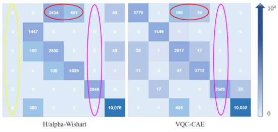 In the experiment, we compared our VQC-CAE model with the H/alpha-Wishart algorithm. The classification results after coloring are shown in Figure 10c,d, where (c) is the result of H/alpha-Wishart, (d) is the result of the VQC-CAE model. The results of the experiment were processed by masking the pixels in the unlabeled area to black according to the ground truth in order to be consistent with the ground truth. First of all, comparing the two classification results, it can be seen that the six types of objects were all distinguished by VQC-CAE. However the traditional H/alpha-Wishart classification was not able to separate light blue (peas) from pink (beet) in the area of A, as all the pixels of peas were mixed into beet. On the contrary, each type of objects was distinguished with our approach. This can also be seen from the red oval box of the confusion matrix in Figure 11, Confusion Matrix M1 was from the comparison method H/alpha-Wishart and M2 was from the proposed VQC-CAE method. The number of pixels in category 1 divided into category 3 reached 3434, and no pixels are classified into the first category in yellow oval box. At the same time, it can be seen from the purple oval boxes in the confusion matrix that only the fifth number in the fifth column had a value other than 0, which means that the classification accuracy obtained from the two methods for the fifth category of soil was 100%. In addition, we present the classification results of the model without Gaussian smoothing loss in Figure 10e. In contrast with (d), it can be seen in areas B and area C that the lack of Gaussian smoothing loss meant that the model could not distinguish pink (beet) and light green (wheat) areas, and several categories were mixed together.