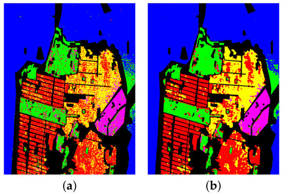 The classification of PolSAR images can be divided into unsupervised, supervised and semi-supervised classification methods. Van Zyl [2] proposed the first unsupervised classification algorithm, which compares the polarization characteristics of each image pixel with the simple scattering categories (such as even scattering, odd scattering and diffuse scattering) to classify scattering behaviors. The algorithm provides useful information about different ground objects. Pottier and Cloude [3] proposed an unsupervised classification algorithm based on target decomposition theory. The target entropy (H) and the target average scattering mechanism (scattering angle: alpha) are first calculated with the coherence matrix T; then, the two-dimensional plane constructed by H and alpha is divided into eight intervals which respectively represent the objects with different physical scattering characteristics. Thus, it can achieve eight categories of object classification. However, due to the pre-set region boundaries on the H and alpha planes, the classification results lack details, clusters may fall on the boundaries and a region may contain multiple clusters. Subsequently, Lee et al. [4] proposed a new unsupervised classification method that combines the polarization target decomposition and maximum likelihood classifier with a complex Wishart distribution [5]. The classification result from H/alpha decomposition [3] is used for the initial clusters; then, the K-means algorithm is used to iterate the initial clusters to obtain the final classification result. Because of its computational efficiency and generally good performance, it has become the preferred benchmark algorithm, but its classification process completely relies on K-means clustering which may lead to convergence to a local optimum. Later, Lee [6] proposed a complex Wishart unsupervised classification based on Freeman–Durden decomposition. The first step is to apply Freeman–Durden decomposition to divide pixels into three types of scattering: surface scattering, volume scattering and double bounce scattering. Each type of scattering is initialized to 30 clusters according to the scattering intensity. Finally, with the merging criterion based on the Wishart distance, the initial small clusters are merged to several large clusters for each scattering category. The convergence stability of this algorithm is better than the previous H/alpha-Wishart classification algorithm, and the uniform scattering mechanism of the class is retained. In addition, the algorithm is also flexible in terms of selecting the number of classifications. However, this method easily misclassifies the human target buildings and rough surfaces of double bounce scattering as volume scattering. In 2015, Guo et al. [7] proposed an unsupervised classification method for compact polarimetric SAR (C-PolSAR) images, which improved the classification results.