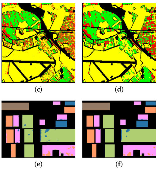 Comparison of basic H/alpha-Wishart classification map and post-processed classificationmap with mean filter. (a) The classification result of H/alpha-Wishart (basic) for San Francisco.(b) The classification result of the basic approach with a mean filter for San Francisco. (c) Theclassification result of H/alpha-Wishart (basic) for Oberpfaffenhofen. (d) The classification result ofthe basic approach with a mean filter for Oberpfaffenhofen. (e) The classification result of H/alpha-Wishart (basic) for Flevoland. (f) The classification result of the basic approach with a mean filterfor Flevoland.