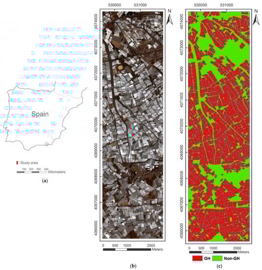 Location of the study area: (a) General situation in Spain; (b) RGB WorldView-3 Multispectral orthoimage; (c) ground truth including greenhouse class (GH) in red and non-greenhouse class (Non-GH) in green. Coordinate system: WGS84 UTM Zone 30N.