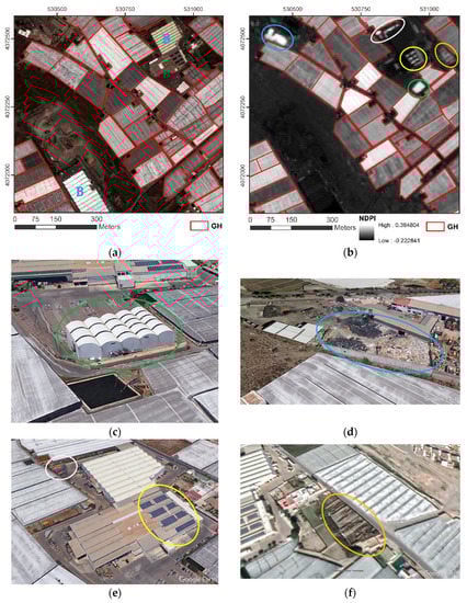 Figure 5 shows the capabilities of the NDPI index to classify plastic materials. All the PCG in Figure 5a presented an NDPI value ranging from 0.225 to −0.035 (Figure 5b). It is important to note that, in June, there were already some whitewashed greenhouses receiving pepper and tomato plants during the months of July and August. In these whitewashed greenhouses, the spectral signature of the plastic cover is masked and, therefore, the value of the NDPI drops significantly. In this way, the whitewashed greenhouses in Figure 5a presented a lower NDPI value (shades farther from the white color) in Figure 5b. The two farm buildings (non-plastic material) marked with the blue letter B in Figure 5a had NDVI values lower than -0.11. In addition to greenhouses, other objects presented high NDPI values in Figure 5b. Among them, we can see: (i) an agricultural building with a plastic cover (Figure 5c); (ii) a local plastics recycling plant (Figure 5d); (iii) piles of agricultural plastic crates (Figure 5e, white ellipse); (iv) plastic solar panels where plastic is used for connecting components, including thrust washers, electrical insulators, pipes, valves and other fittings (Figure 5e, yellow ellipse); or (v) an abandoned greenhouse with its plastic cover very run down and broken (Figure 5f).