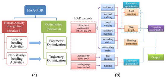 Based on the human activity recognition (HAR) results, our adaptive human activity-aided pedestrian dead reckoning (HAA-PDR) system is designed. As shown in Figure 1, the HAR results are used in two parts of the system, parameter optimization and trajectory optimization.