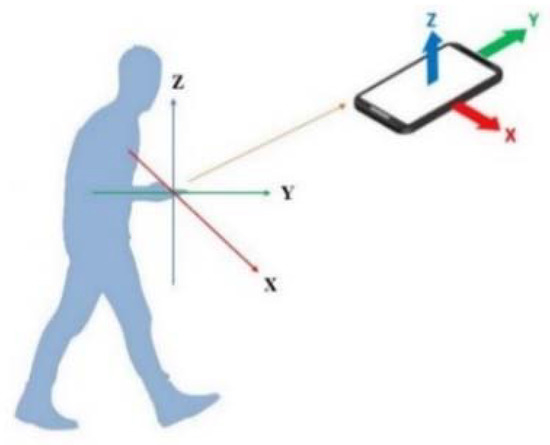 The sketch of using the phone with pose of ‘holding’. The person holds the phone horizontally. The pointing directions of the three orthogonal coordinate axes of the phone frame system are X-axis pointing towards the right, Y-axis pointing towards the front, and Z-axis pointing upwards.