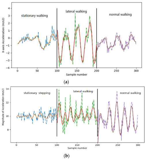 (a) The change of X-axis acceleration and (b) the magnitude of combined acceleration for stationary stepping, lateral walking, and normal walking (sampling frequency: 50 Hz).