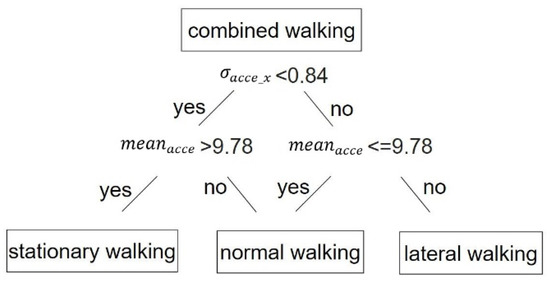 We chose the decision rule-based decision tree (DT) as our classifier to recognize three types of walking and compared this to two popular baselines, Random Forest and KNN. The flowchart of this method is shown in Figure 4. Firstly, two features, and , are extracted from the filtered accelerometer data. Secondly, three rules are designed to discriminate stationary stepping, normal walking, and lateral walking.