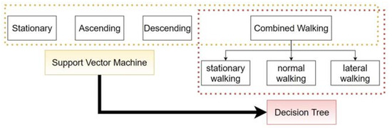 To sum up, the approach we used to recognize six steady-heading activities is the hierarchical combination of SVM and DT as shown in Figure 5. First, SVM was used to recognize stationary, ascending, descending, and combined walking. Then, DT was used to further discriminate normal walking, lateral walking, and stationary stepping. The experimental performance shows that this combination has a better performance by over 9% than using SVM alone. The significance of this approach is that when the recognition accuracy of the six activities was insufficient, we performed a deep investigation of the performance of each activity and used a hierarchical combination of two traditional machine learning algorithms to improve the recognition accuracy instead of significantly increasing the complexity of the recognition model as some popular deep learning algorithms do, e.g., CNN, VGG, ResNet, Inception, Xception, etc. Moreover, our approach achieves very high recognition accuracy using only a few samples, so it is very efficient.