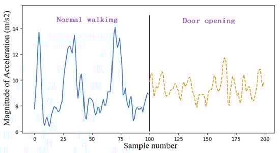 Fluctuation of the magnitude of accelerometer for door opening and normal walking.