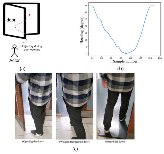 One example of the change of heading when the user performs door opening. (a) demonstrates the process of opening a door and going through it. The red arrow indicates the change of heading in this process. (b) The corresponding change of heading numerically. (c) Pictures of the door opening activity showing a heading change.