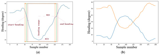 (a) Showing the segmentation of the heading sequence using a fixed size window. The orange dotted rectangle is the heading window in which the first heading is about 8 degrees more than the last heading. The red dashed rectangle is the heading window in which the last heading is about 8 degrees more than the first heading. The green valid rectangle is the heading window in which the first heading equals to the last heading. (b) The reverse of the heading sequence from left to right to create additional training data.