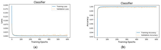 Figure 10 shows the training and validation’s loss and accuracy of the classifier over training epochs in (a) and (b), respectively. The blue solid lines represent the training set and the orange dashed lines represent the validation set. The number of training epochs is 600.